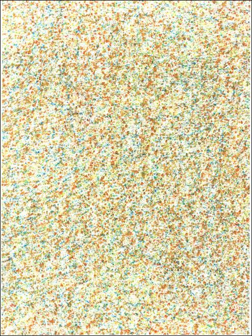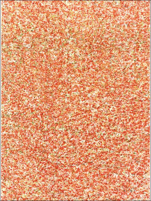 Winzige Wachsfarbpartikel füllen das Bild, zeigen sich in ihrer Farbigkeit, überlappen andere Farben, verändern dadurch ihren Tonwert und füllen kleine und große Flächen. So entstehen die monochromen Farbtafeln, die Farbklänge und die geometrisch gegliederten Farbfelder. |